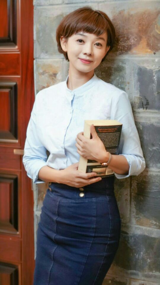 岳菁蔚身穿这款淡蓝色衬衫与那蓝色系牛仔裙装配合在一起,看起来漂亮文雅又能看到下身圆润的曲线,那炯炯有神的眼睛与那短式的发型配合起来,更能展现出现代人美的气息,与那优雅的动作看起来更加有学问感。