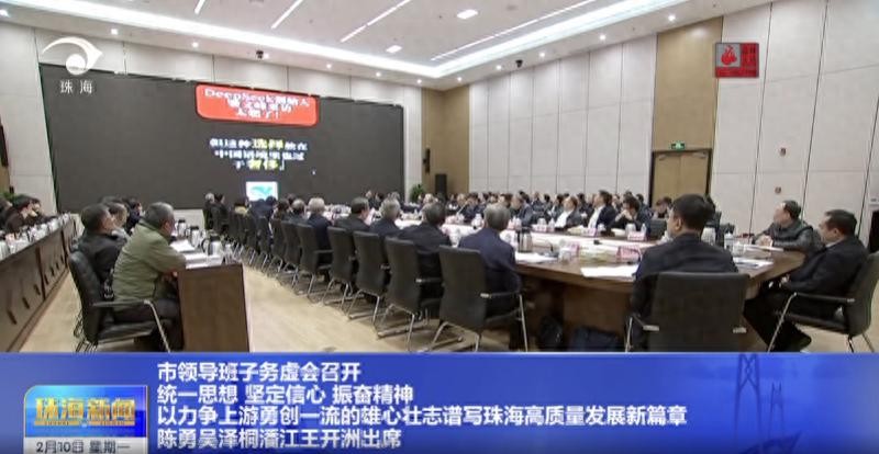 2月10日,珠海市领导班子务虚会召开。当晚,不少细心市民从本地电视台的新闻画面中发现会议室大型电子屏幕上定格的是DeepSeek创始人梁文锋接受采访的内容。