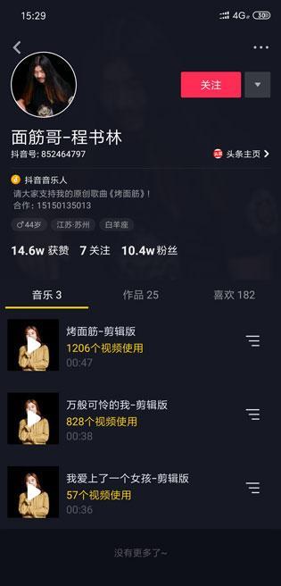 面筋哥抖音号ID个人资料介绍 本名叫程书林已发多首音乐歌曲