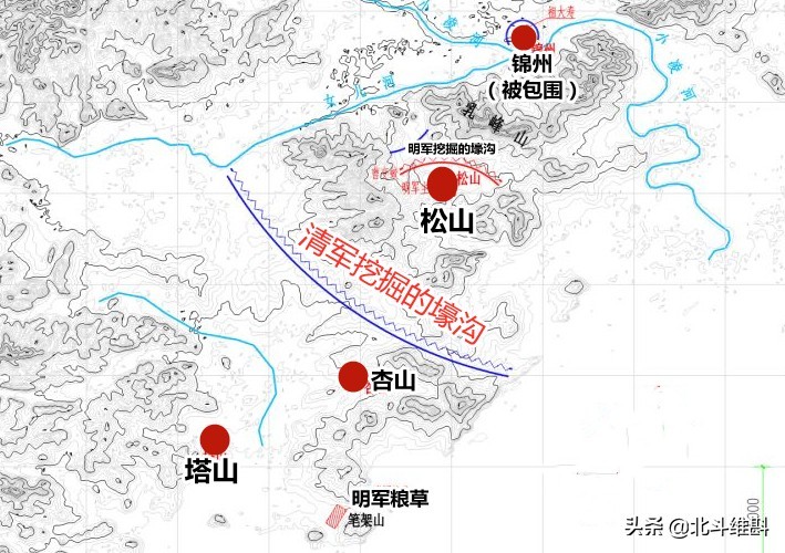 此时,清军陷入了明军内外夹击的状态,被迫转攻为守,出现了危机。情急之下,皇太极从沈阳带领3000精锐先行,到达了松山,寻求决战。见皇太极到来,洪承畴先调遣6万军队修建7座大营,挖掘壕沟。皇太极观察了明军阵地情况,决定也先在外围挖掘了一道长长的壕沟,断绝松山和杏山、塔山之间的联系。这就让,松山、锦州都成为了“孤城”。