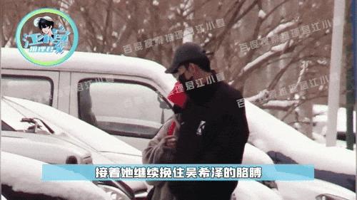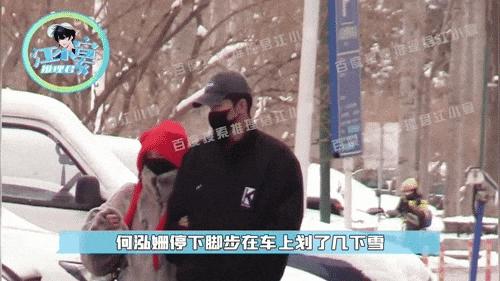 走着走着,何泓姗突然童心大发,用手在落满雪的车上画起简笔画,吴希泽就耐心在旁等着女友画完。