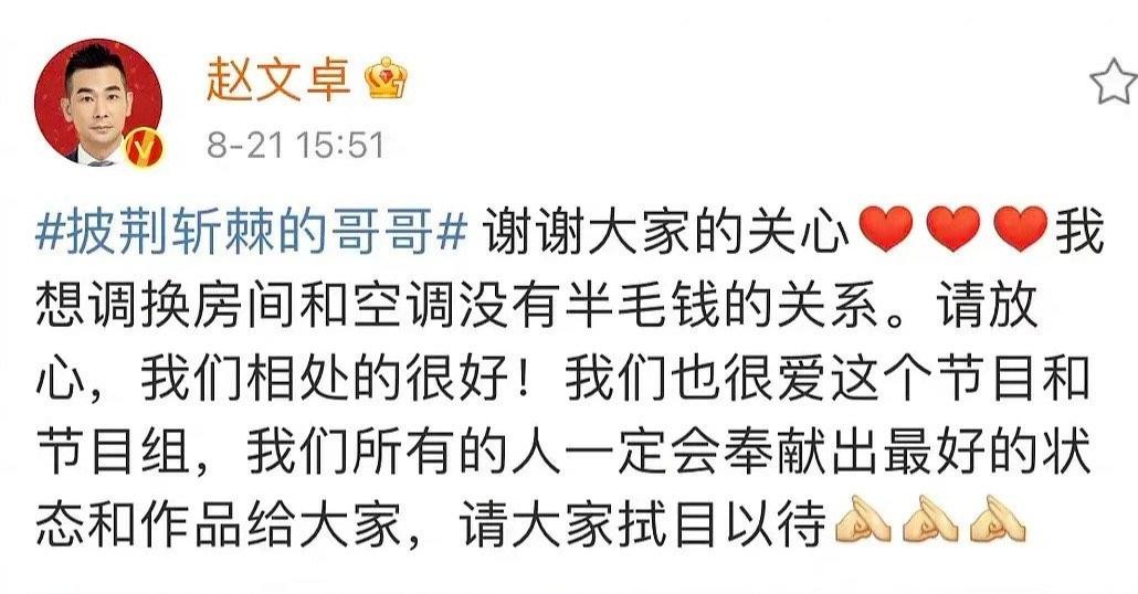 赵文卓发文两分钟后林志炫立马回怼,语气相当不满,并且还说是因为赵文卓养生才不开空调,是自己在配合他,完了赵文卓还甩锅给他。