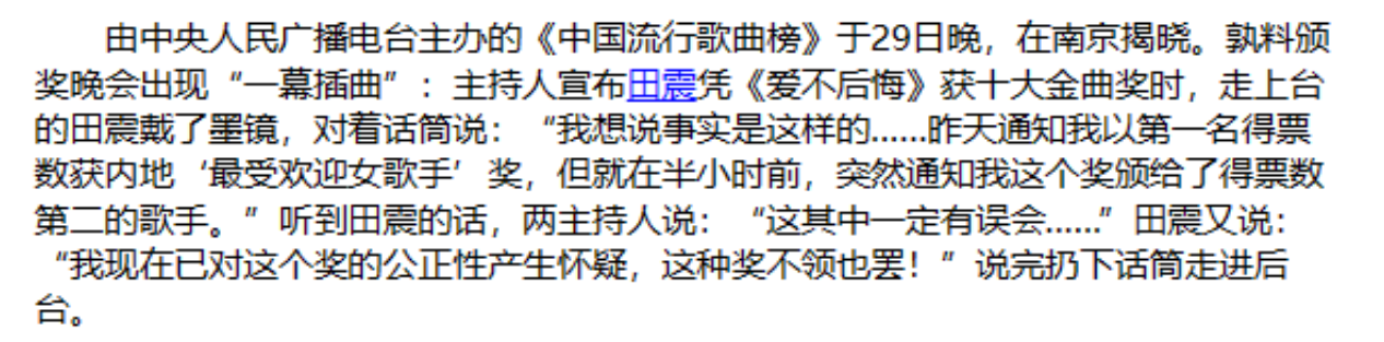 得知必须本人亲自到场领奖后,田震无奈之下只能推掉了演出,并出席了颁奖典礼。