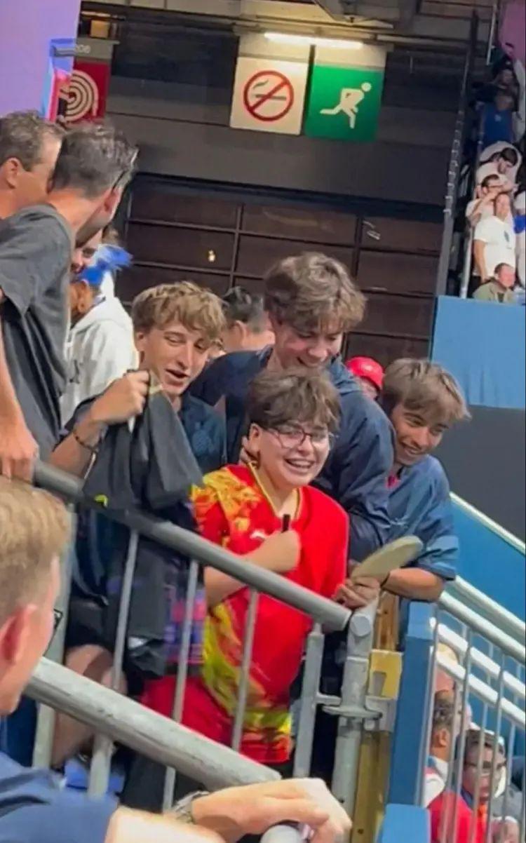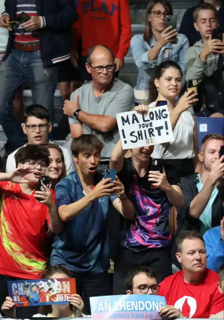 比赛结束后离场时出现了尤其感人的一幕,一个法国的男孩儿,穿着中国队的衣服裤子,手里拿着乒乓球拍高呼马龙,马龙,我爱你,想让马龙签名,马龙毫不犹豫地接到乒乓球拍给男孩儿签字,男孩儿兴奋的一直抱手高喊,小孩子还难以置信且意犹未尽地一直盯着了一会才缓过神来,讲了好多个感谢。