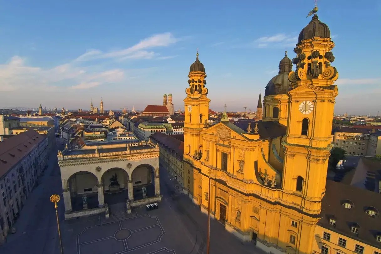 登上新古典主义风格的 Feldherrnhalle 前的台阶,可以欣赏 Odeonsplatz 和 Ludwigsstraße 的美景。另一个亮点是 Theatinerkirche 明亮的黄色外立面,从远处就可以看到。在音乐厅广场上还有德国最大的市中心宫殿:慕尼黑王宫。在附近的 Hofgarten 公园,您可以漫步、放松和玩地滚球。您也可以从慕尼黑中央车站乘坐 U5 前往 Odeonsplatz。