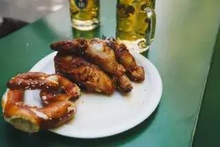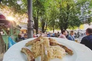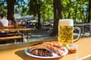 特色菜: 经典的啤酒花园餐:一大杯一升啤酒、一只烤鸡和一个大椒盐卷饼。