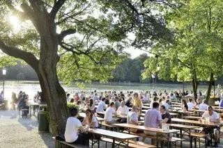 谈到经典啤酒花园,就无法不提及 Waldwirtschaft Großhesselohe(或当地人熟知的 WaWi)。它位于 Isar 河岸周围的高地上,提供令人叹为观止的景色。客人坐在红色座椅(带有舒适的靠背)上,一边欣赏每周更换的爵士乐队轻柔的现场音乐。当 WaWi 的气氛恰到好处时,人们就会穿上舞鞋。