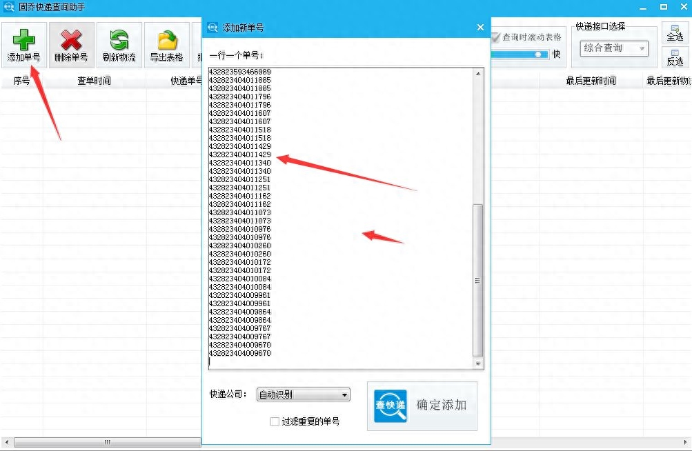 查询前先勾选“过滤重复单号”,这样可以避免单号重复查询,然后点击“确定添加”,软件就开始运行批量查询的工作了。