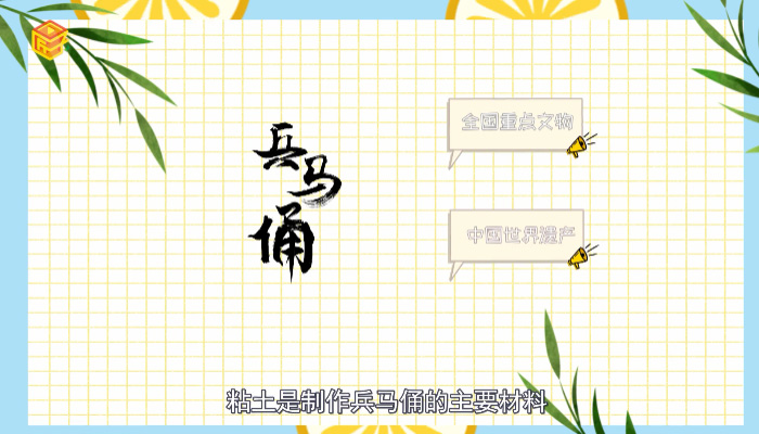 粘土是制作兵马俑的主要材料,由氧化硅、氧化铝、氧化铁等成分组成。然后经过陶冶烧制的方法制成兵马模型。在烧制的初始模型上覆盖一层细泥,然后在细泥上继续加工刻画,使兵马俑的发束、表情、手势更细腻,栩栩如生。