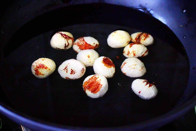 13.打开锅盖,倒入板栗进行炖煮半个小时。