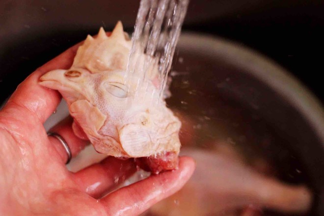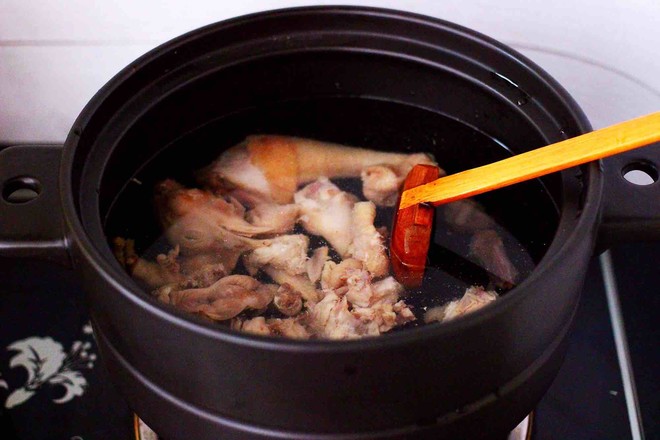 8.砂锅里加入适量的清水,把焯过水冲洗干净的土鸡放入砂锅里。