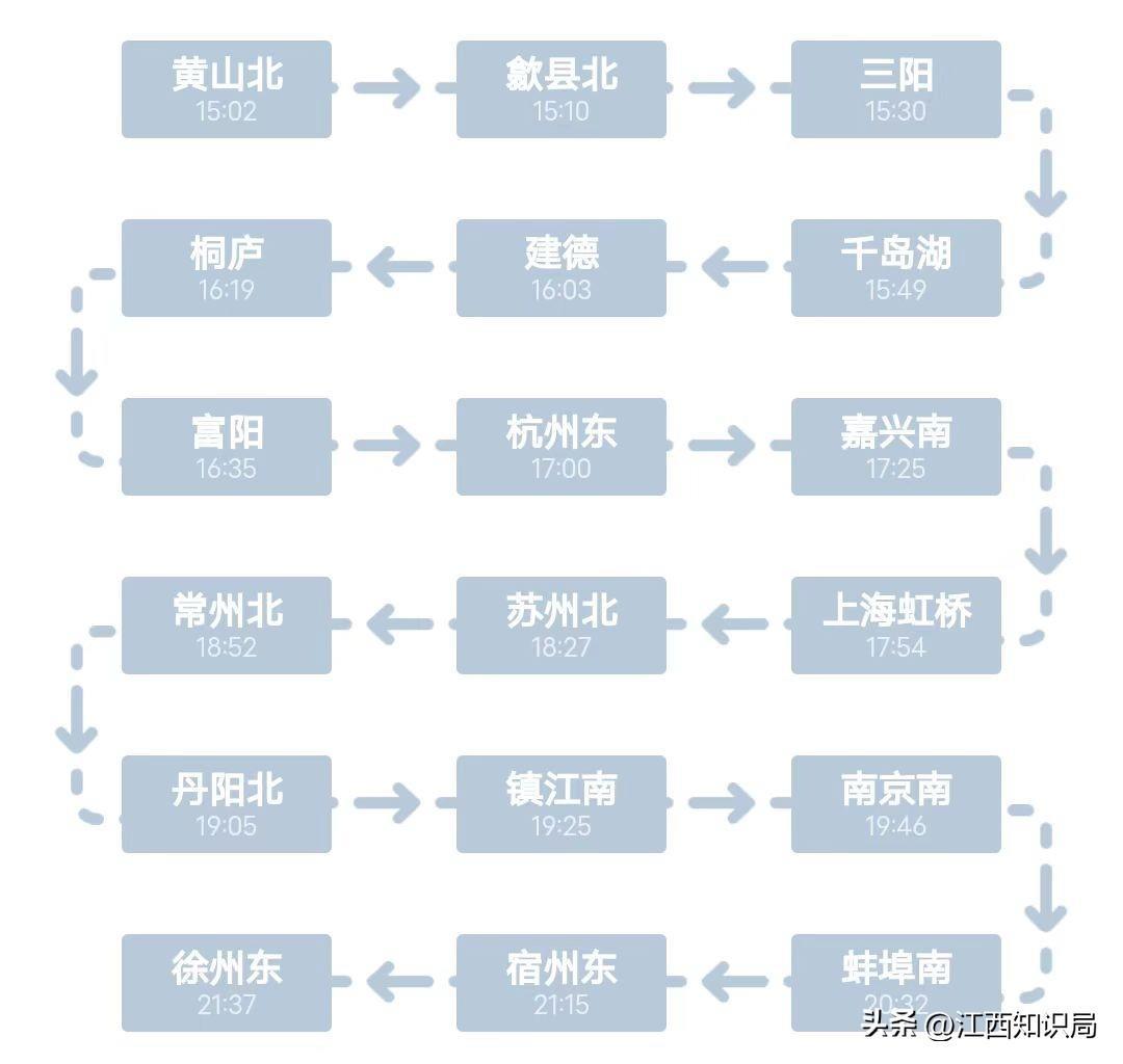 15:02从黄山北出发,21:37到达徐州东,一共停靠18个站点(详情见图),全程历时6小时35分钟,其中会在蚌埠南站停靠21分钟。本次列车由上铁承运,CR400BF-3017担当。