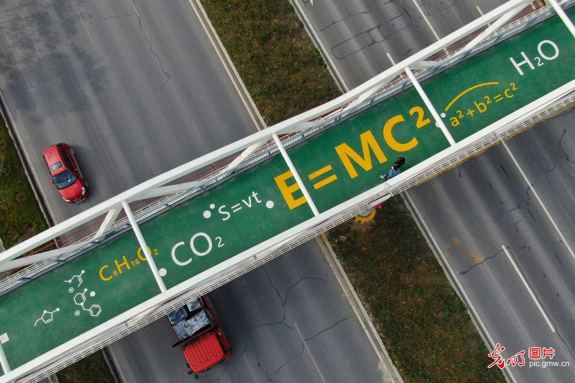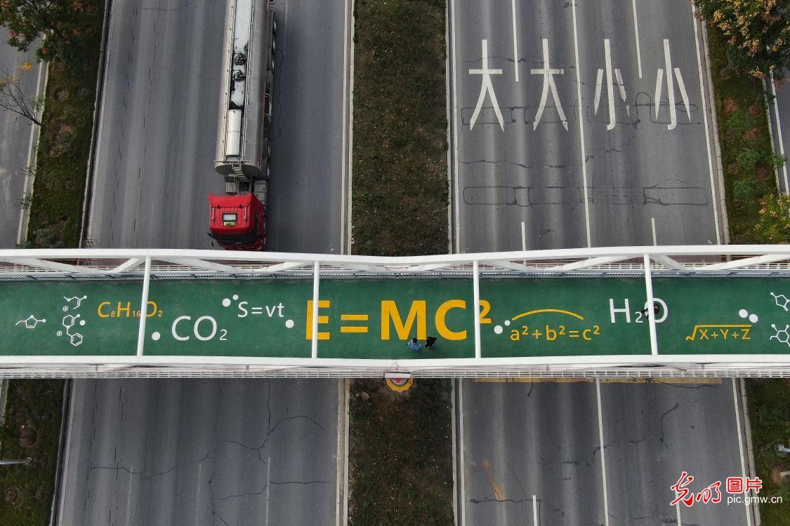 2019年10月24日,湖北省襄阳市,位于襄城区的尹集大学城人行天桥,因桥面涂有数学公式、物理公式、化学式、分子结构式等,被网友称为"数理化天桥",吸引了不少人前来打卡。据了解,2018年以来,襄阳城区新建了16座过街天桥,对桥面进行了各具特色的铺装,植入时尚元素,把天桥变成网红打卡地。(杨东摄/光明图片)