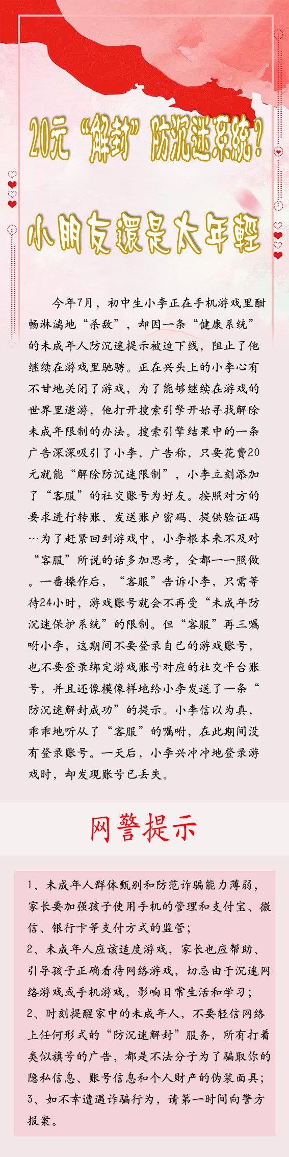 为帮助未成年人养成健康上网的习惯,学会合理分配时间,各类游戏运营商针对未成年人,开发了多种“防沉迷系统”。然而,一些不法分子抓住了未成年人被“防沉迷系统”限制登录时间,迫切渴求“解除防沉迷”的心理,编织起狡猾的骗局。