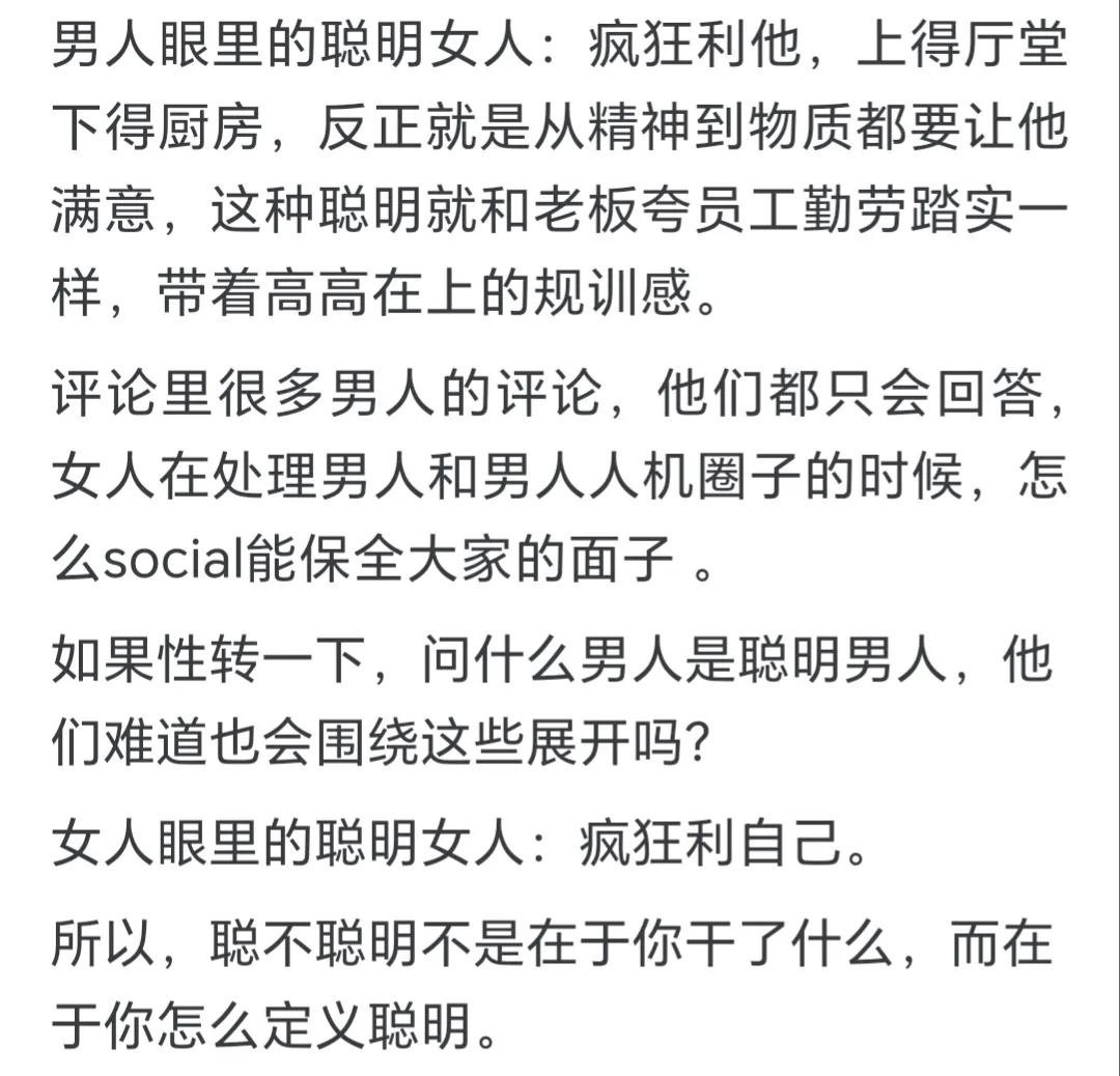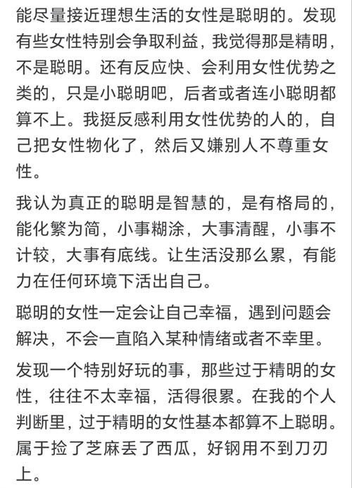 这是你认为对社会有用的女人。真正聪明的女人大事计较小事也可能计较,无论如何不会让自己受委屈知道自己在做什么知道自己在追求什么,有底线有原则这才是聪明的