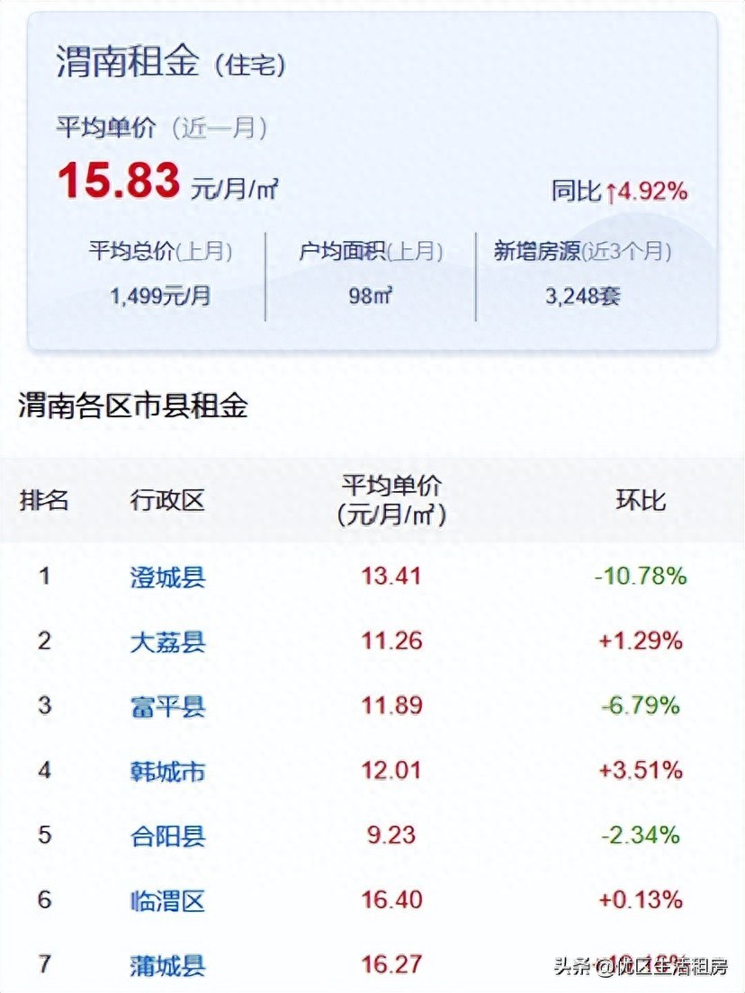 更新下【渭南】各区最新租金水平,数据仅供参考(来自中国房价行情网)。