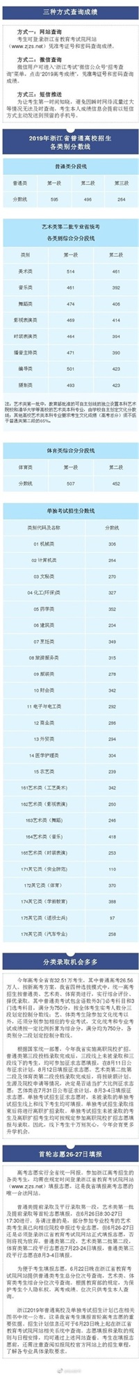 【重磅!2019浙江高考分数线揭晓!】杭州教育昨晚,2019年浙江高考分数线出炉!普通类第一段595分,第二段496分,第三段264分。三种方式可查询成绩。