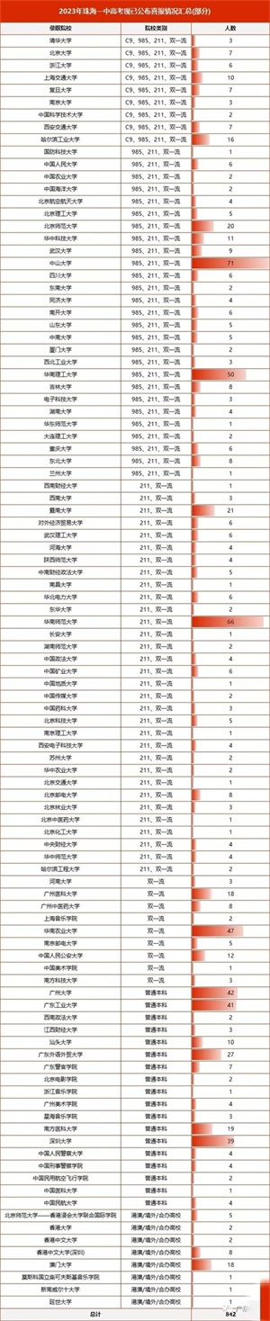 珠海一中今年公布的高考录取名单(部分)共842人,其中清北共10人,C9高校61人,985院校有308人,中大华工共121人。录取到“双一流”高校的学生共589人,占比45.62%!将近一半同学都能考上双一流高校,可见一中学子的实力还是很强的。