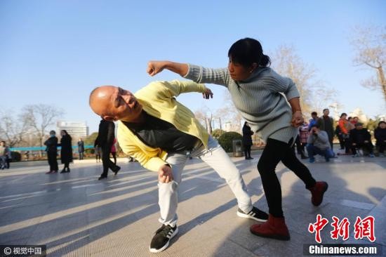 2017年3月1日,河南省郑州市,最近,郑州人民公园内几位大叔大妈自创的“逆天摇摆抽筋舞”突然走红网络。
