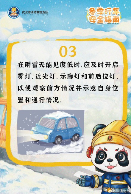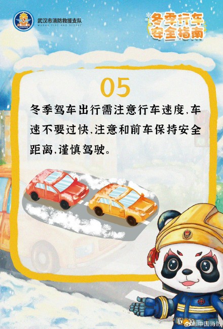 冬季天寒,易出现雨雪天气,雪花虽美,但这种时候如果开车出门一定要留个心注意安全。牢记行车速度不宜快、冰雪路面要降速……更多安全知识,快跟@武汉消防一起学起来!ps:雨雪天气尽量避免不必要的驾车出行~