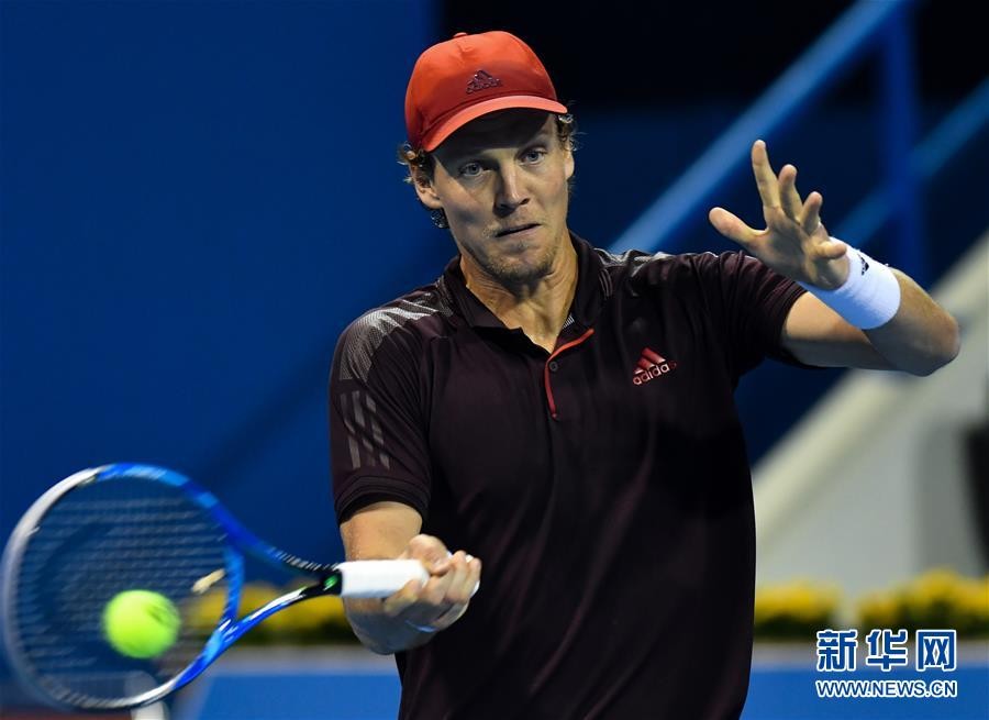 ↑1月2日,伯蒂奇在比赛中回球。当日,在卡塔尔首都多哈进行的2018年ATP卡塔尔公开赛首轮比赛中,捷克选手伯蒂奇以1比2不敌德国选手施特鲁夫,无缘下一轮。新华社发(尼库摄)