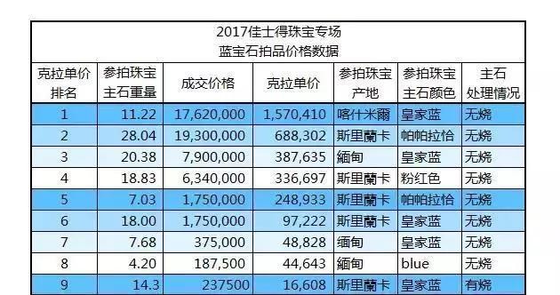 我们将视线又回归到现在,在去年的2017年香港佳士得秋拍上,斯里兰卡所产出的帕帕拉恰在拍卖会上大放异彩,所占蓝宝石拍品20%,而它的克拉单价排名位于2017年佳士得珠宝专场的第二名。
