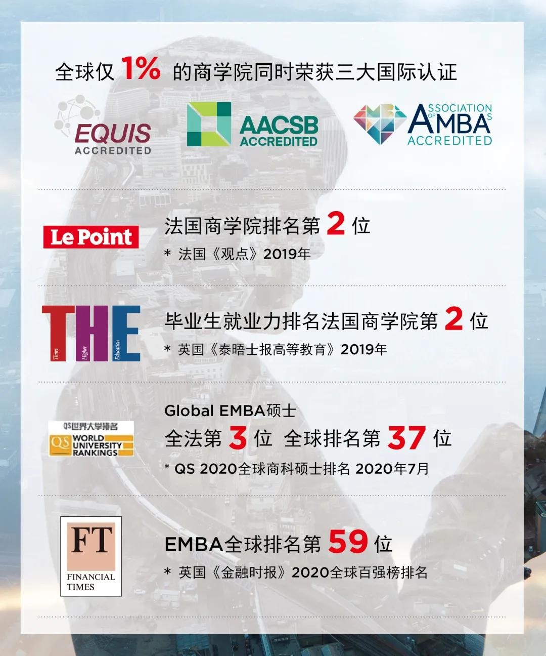 里昂商学院EMBA全球排名领先,2020年度在FT金融时报排名全球第59,QS全球排名第37