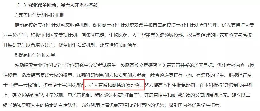 8月23日,上海市教育委员会等3部门就加快新时代本市研究生教育高质量发展提出意见。意见提出,继续推行博士“申请—考核”制,拓宽博士生选拔通道,扩大直博和硕博连读比例,开展直博生和硕博连读的长周期贯通培养。