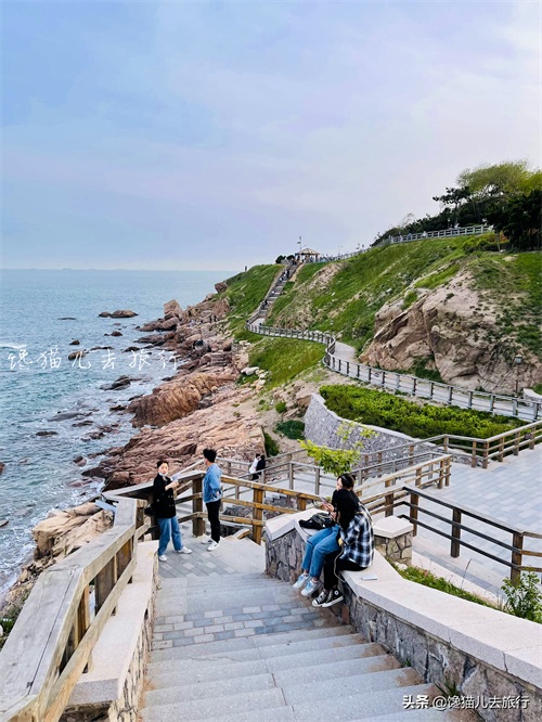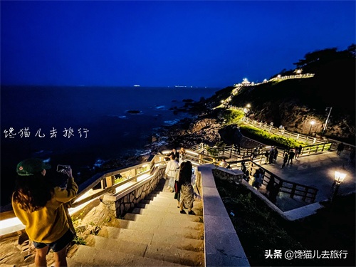 去燕儿岛可以赶在下午去,先下到海滩和礁石上拍照、亲海、玩水,再趁着天亮,多拍点个人照,然后去山顶坐等夜景。燕儿岛的网红栈道一半依山,一半傍海,白天的时候,和碧海、蓝天、礁石、绿地一起组成风景,等到灯光亮起来,它就艳压群芳、一枝独秀了。