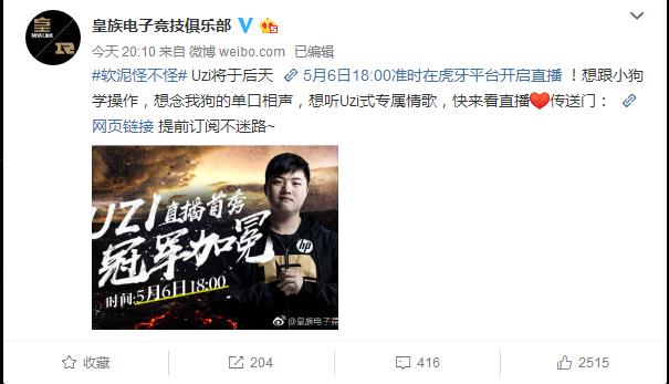 最近uzi发微博称要在五月六日虎牙直播首秀。距离上回直播也有一百来天了,这个消息对于粉丝们来说再好不过了,可是为什么rng是由熊猫直播赞助,其他rng队员也都在熊猫直播,为什么uzi会去虎牙,难道是因为签约金嘛?