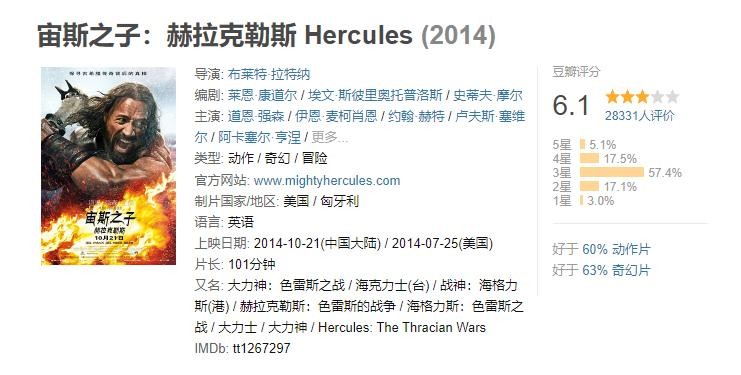 《宙斯之子:赫拉克勒斯》虽然这部影片豆瓣评分只有6.1分,但还是可以的。古希腊神话被改编为电影并不少见,2014年在美国上映的就有两部大力神片。