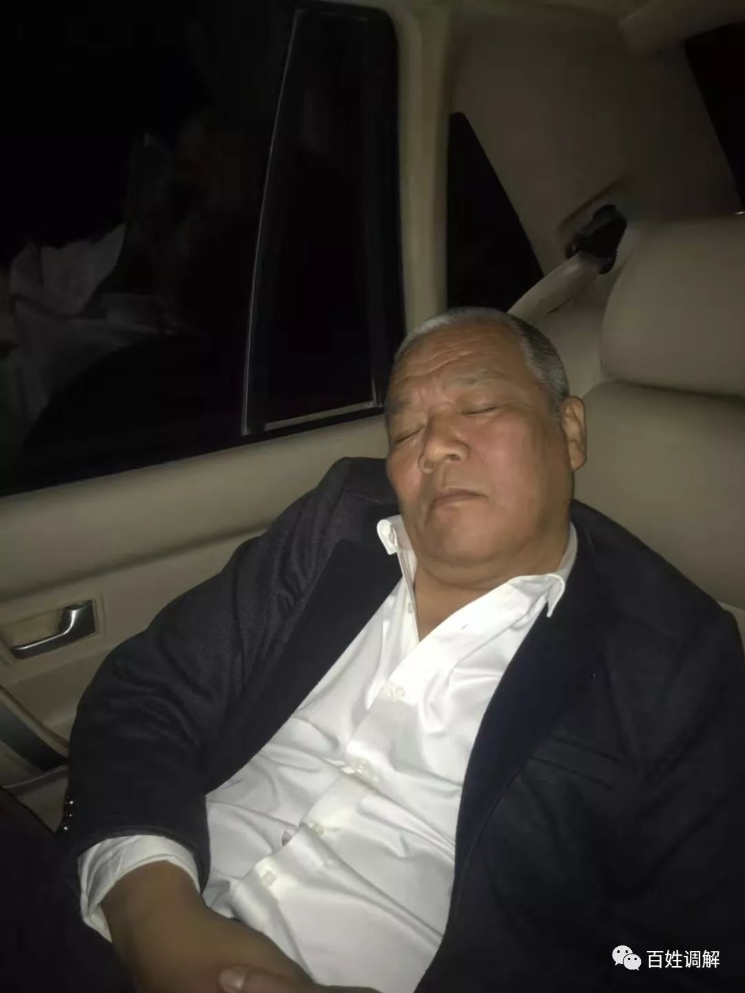 困意来袭,辛苦一天的调解员褚劲松靠在车里睡着了