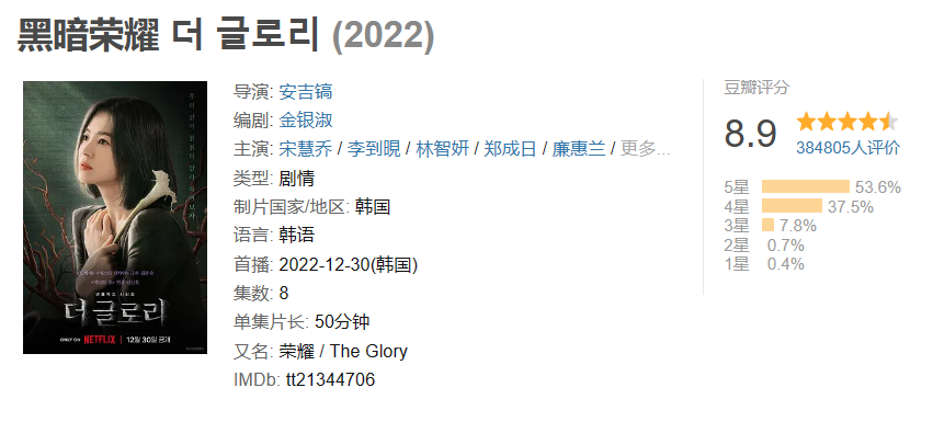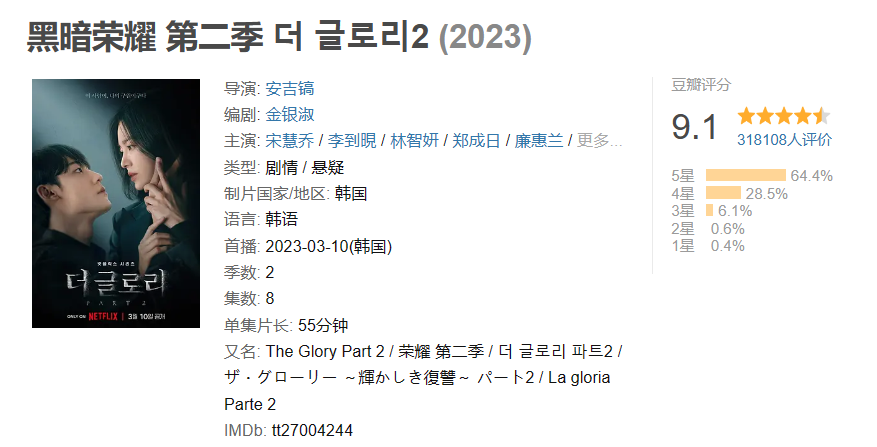 ⑦黑暗荣耀 评分(第一部8.9 第二部9.1)