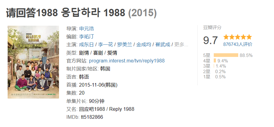 1988的每一集都很有深意很有看点,都有戳到你内心深处的情节,非常治愈,把亲情爱情友情都表现的淋漓尽致!!!