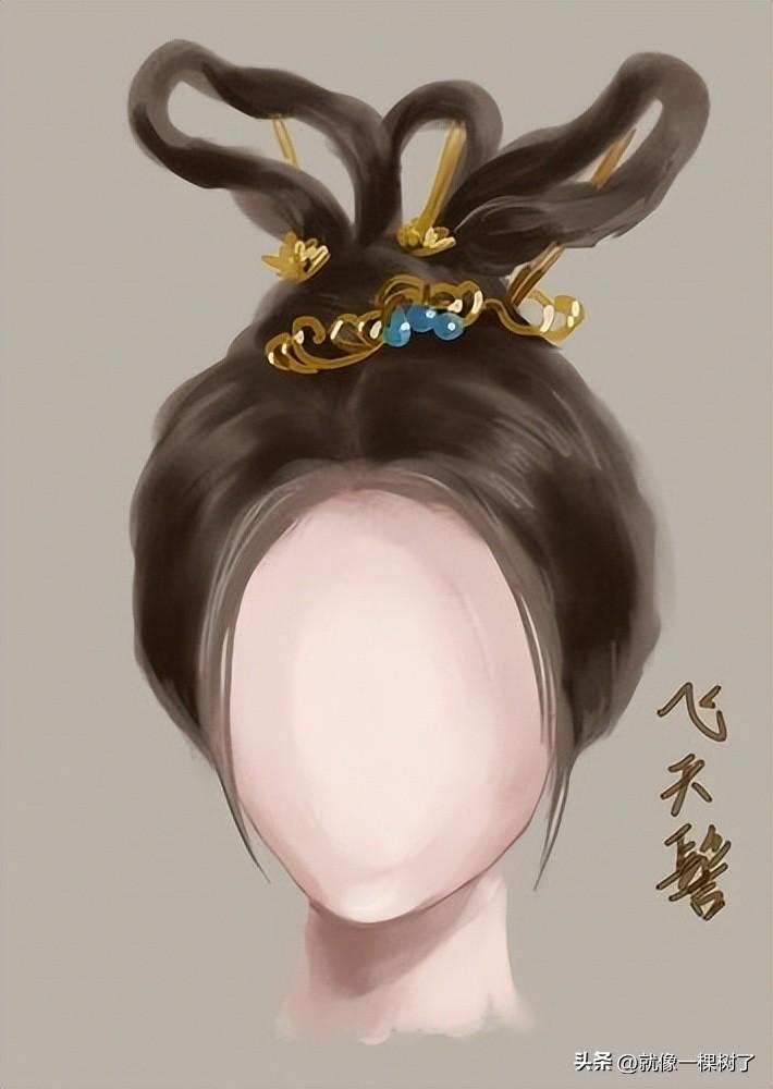 飞仙髻多是两侧结高鬟,始见于汉代,其式绾发于顶,呈飞动状。据《炙毂子》记载:“汉武帝时,王母降,诸仙髻皆异人间,帝令宫中效之,号飞仙髻。”多用于仙女与未出室少女。