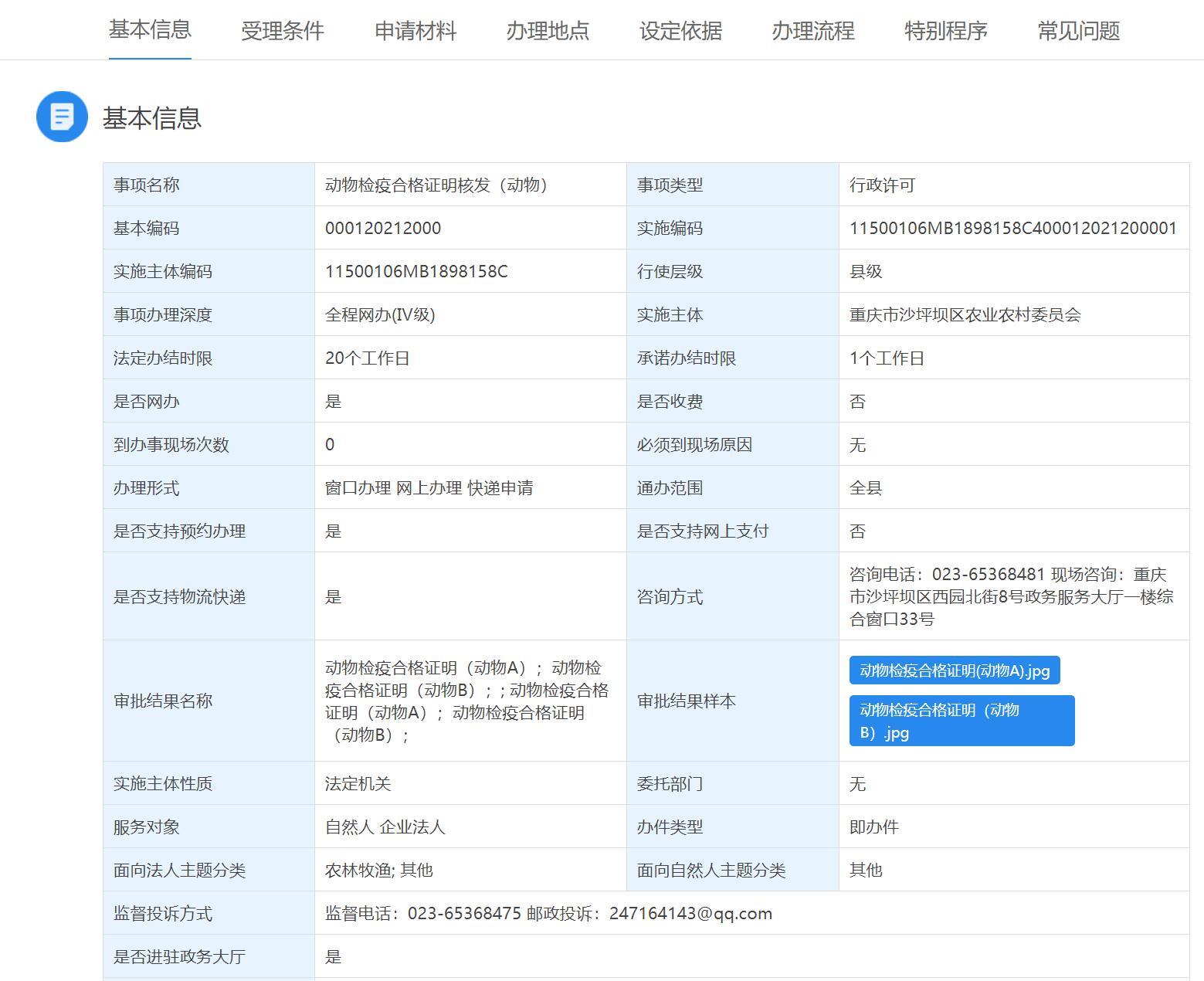 比如猫君前往重庆政府网网上办事大厅搜索《动物检疫合格证明》能获取到很多信息,这里得夸一下政务系统。