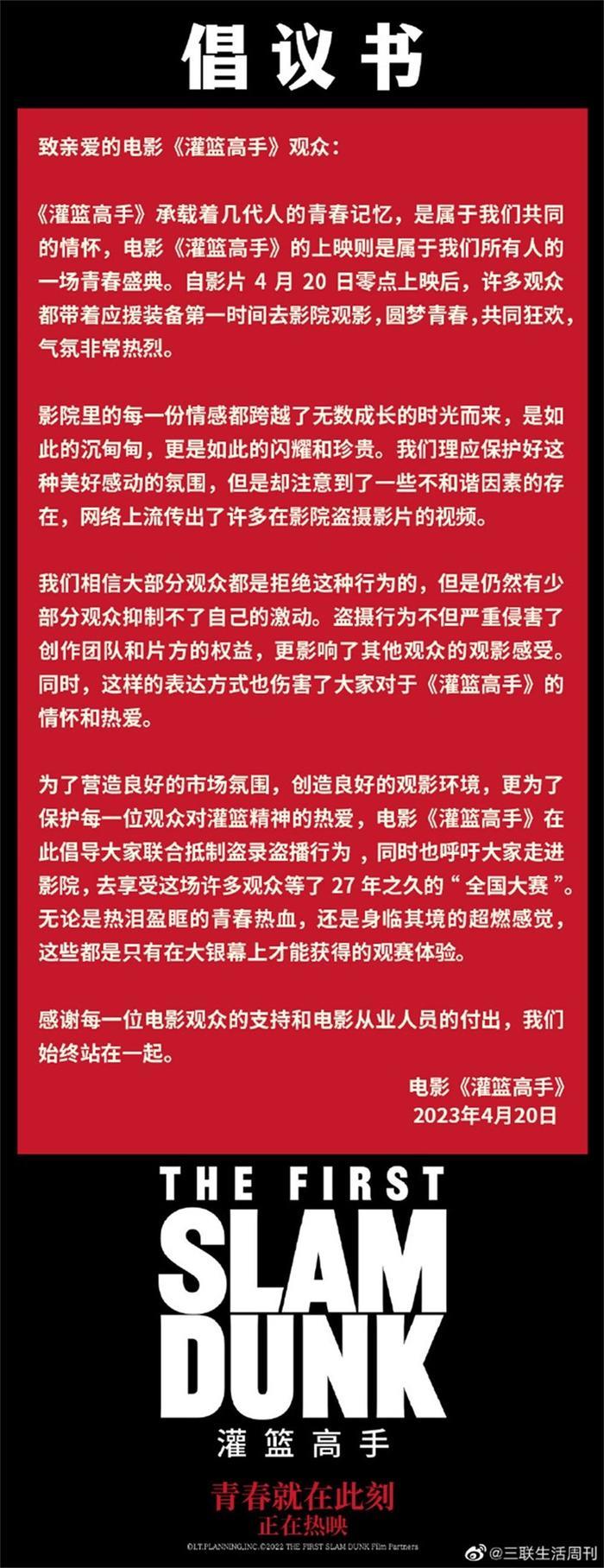 之后电影《灌篮高手》的官方微博指出“盗摄行为不但严重侵害了创作团队和片方的权益,更影响了其他观众的观影感受”,片方发出倡议,呼吁观众抵制盗录盗播行为。各大主流媒体也纷纷下场评论,关于屏摄盗摄的行为引起大众关注。