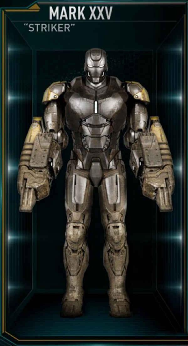 Mark25名称为“冲击者”(Striker),又名:打击者(Thumper)。重型建设用装甲,它是为了施工而创造的,强大的双臂附加配备了类似与手持式凿岩机机械手,可以轻易粉碎军用级别混凝土,还可以承受高温和电流冲击。