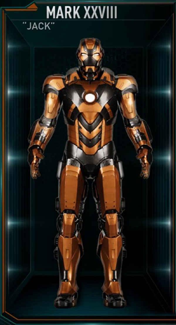 Mark28名称为“杰克”(Jack),杰克同样也是一款防辐射战甲,它的涂装是采用的类似于辐射警告标志的意思,不过托尼将辐射警告标志的黄色提升为橙色,这表明它可以承受极端辐射。