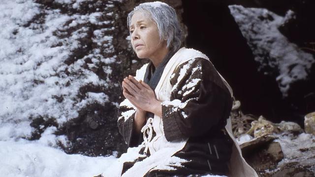 这时辰平的心情十分的复杂,忘记了不可回头的规矩转身就往山顶跑,他看到妈妈呼喊着:“妈妈,下雪了,这是吉兆”但是已经满身披雪的阿玲婆听到喊声只是轻轻的挥了挥手让他回去。在风雪中,她双手合十,静待死亡,此时此刻这个丑陋佝偻的老人在死亡面前却显得如此端庄圣洁,这个坚忍的母亲能够包容世间的一切以她的慈悲,庇佑儿孙。