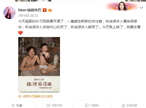 在“跑男团”中加入比较晚的迪丽热巴在18日晚上便发微博给邓超电影做宣传,她表示:“今天超哥的补习班就要开课了,一直都在默默的关注着,听说很多人看完很感动,听说很多人发自内心的笑了,听说很多人都哭了。今天就上映了,我要去看”