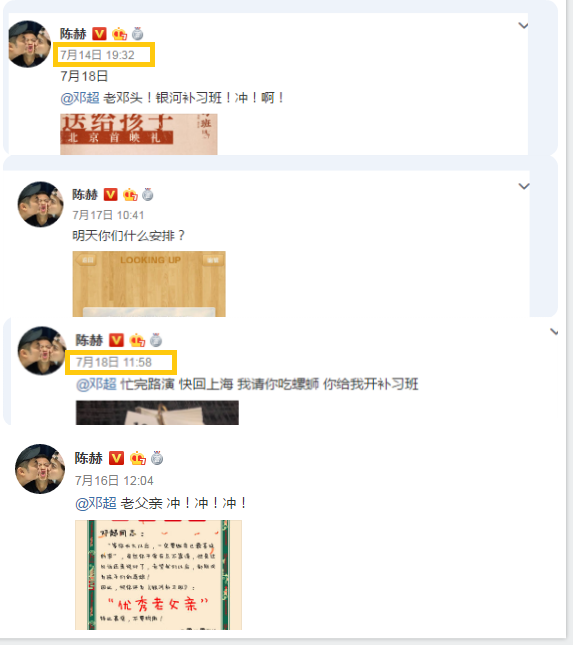 值得一提的是与邓超一同退出跑男的陈赫更是连续四天发文宣传自己好哥们的电影。在14号陈赫发文“老邓头!银河补习班!冲啊”,之后又在连发三天微博宣传。这一个小小的举动看似平凡,但也显现出陈赫的情商与他们俩之间的深厚友谊。