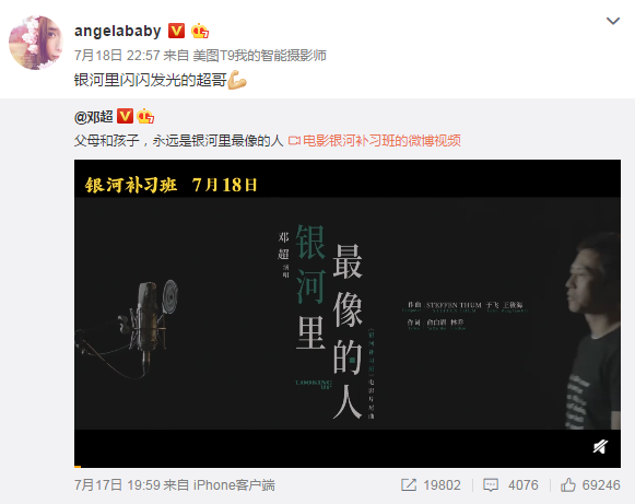 跑男的老成员杨颖也在第一时间发文“银河里闪闪发光的超哥”并加上加油鼓励的表情。