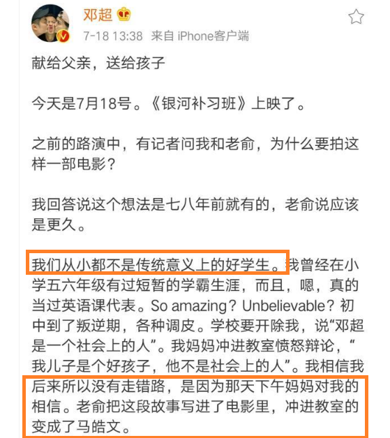 邓超在文中提到自己小时候就不是一个学霸,反倒是大家口中的差生,但是在妈妈的支持鼓励之下他才走上正途,而此剧编剧也将邓超妈妈这个角色写入电影中化身成了马皓文。