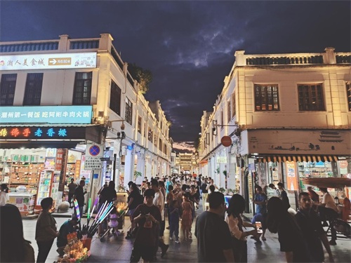 傍晚6点,灯光抢先阳光照亮商店,景点让路铺位。