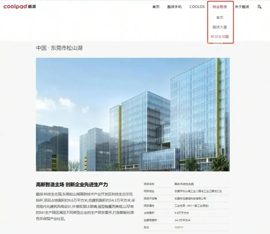 据相关消息了解,在视频中呈现的酷派厂房,如今有大量的空间在对外出租。更让人惊讶的是,它的官网竟然新增了物业租赁板块。