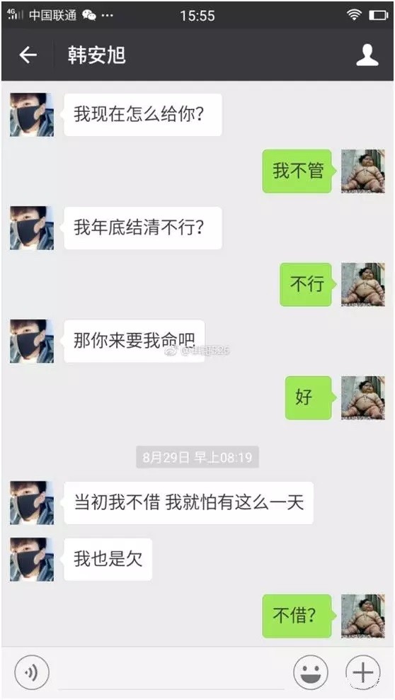 在琪琪的微博里曝光了与韩安旭的聊天记录,内容显示韩曾向琪琪借了一百万买车,到现在一直没有还钱。对此,韩安旭在直播中回应自己认了,称自己不是怂了,算是经历的坎,欠琪琪的钱年前肯定还她,这件事情就过去了。不过韩安旭在直播中却绕过了同时与多个女土豪交往的事情。