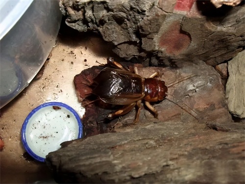 人工蓄养花生大蟋必须遵循它的自然习性,虫具选择应以宽敞些为原则,体积较大的瓦盆或透明的塑料质、有机玻璃质的长方形盒箱内是不错的选择;而养在蛐蛐罐、盆中则很少会叫,一是因为空间较小,二来无法做到穴深而居。有网友用大号龟盒铺设十厘米深的椰土后蓄养,里面再放置些树皮等作为掩体,方便它攀爬、隐藏。花生大蟋食性较杂、食量较大,豆类、米饭、蔬菜、水果都可作为它的食料。最重要的是千万不能缺水,可用一个小盆盛点水放在虫具中,供其饮用。(图片转载自网络,作者@雅鸣)