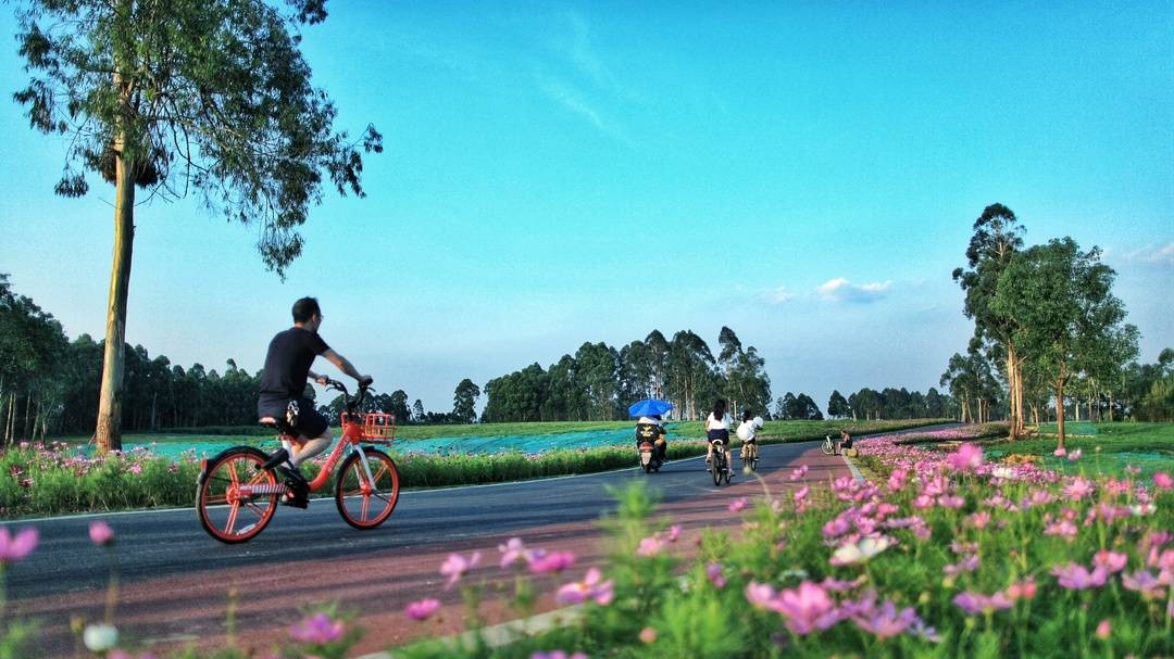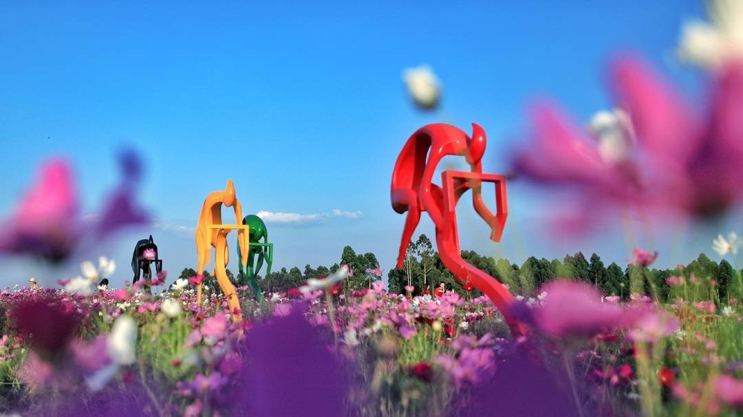 沿着绿道往回走,一些极具川西风味的工艺雕塑渐次出现。憨态可掬的大熊猫躲于格桑花丛,像在偷窥花间回眸拍照的美女;驱牛耕地的农夫手臂上扬,姿势定格在甩动牛鞭……
