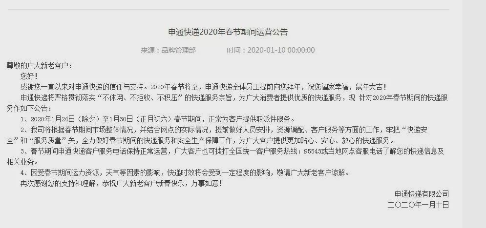 各大快递公司公告显示将于2020年1月24日(除夕)~1月30日(正月初六)开启春节运营模式,正常为客户提供取派件服务,另外,快递企业表示,春节期间将根据市场整体情况,结合网点实际情况,提前做好人员安排,资源调配、客户服务等各方面的工作。